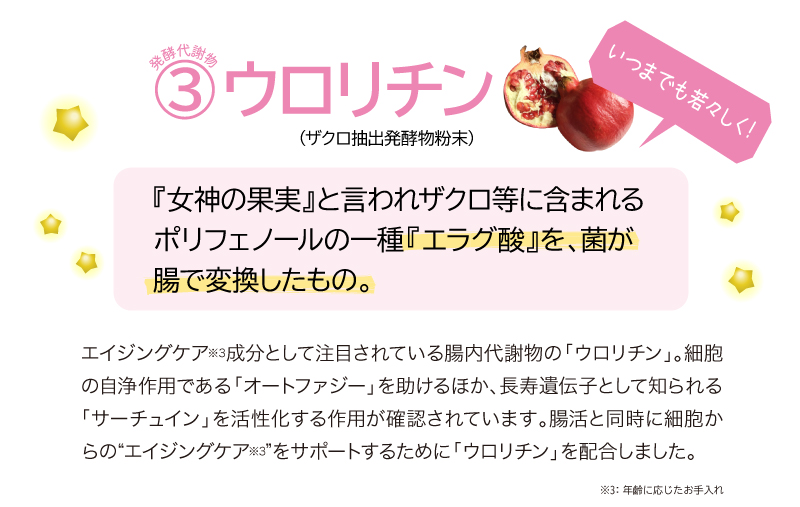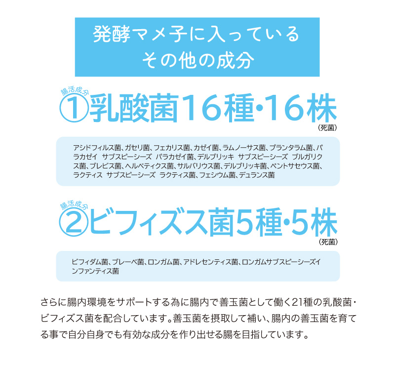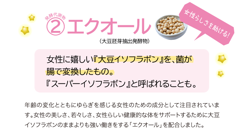 原材料名 | BG・21菌発酵物粉末(大豆・乳成分を含む)(国内製造)、大豆胚芽抽出物、乳糖発酵物(乳糖発酵液、乳糖)(乳成分を含む)、ザクロ抽出物、黒大豆種皮抽出物(黒大豆種皮エキス、デキストリン)、大豆胚芽抽出発酵物(エクオール含有)(大豆を含む)、ザクロ抽出発酵物粉末(マルトデキストリン、ザクロ抽出発酵物)(ウロリチンA含有)(大豆を含む)、マルトデキストリン/環状オリゴ糖、HPMC、ステアリン酸カルシウム、カラメル色素、二酸化ケイ素 |