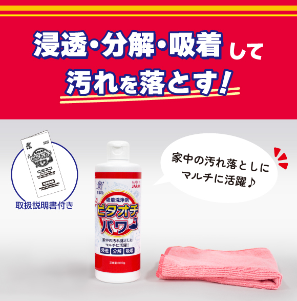 | ご使用方法 | (1)付属の乾いたマイクロファイバークロスに適量を取り、汚れている箇所に塗り広げ、汚れになじませてからこすってください。(2)吸着成分が白く残りますので、乾拭き、または水拭きでしっかりと拭き取ってください。水洗いが可能な箇所は、十分に洗い流してください。※衣類に使用する場合は直接塗布してこすり洗いをした後、10分程置いてから水洗いまたは洗濯機で洗ってください。※詳しい使用方法は取扱説明書をご確認ください。 |