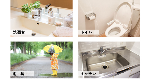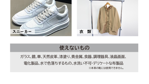 | 用途 | 水周り、布製品、靴、合成皮革、木製品、雨具、コンクリート、タイル、陶器、金属、プラスチック※本革の靴には使用できません。 |